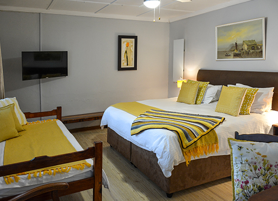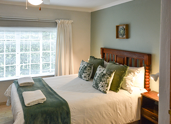 The Garden Studio is a large, open plan studio apartment with an inviting king-size or twin single beds, an en-suite bathroom with shower, a well-equipped kitchenette and living space. The kitchenette has a mini-stove with two hotplates and small oven, a microwave, bar fridge, toaster, and tea and coffee facilities. There is a wall-mounted TV with DStv to one side along with a dressing table, chest of drawers and dining area. This unit sleeps 2 with a child on a mattress on the floor if necessary.